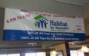 Kona Impact makes several thousand square feet of banners over a year. Banners are one of the most popular temporary sign choices for Kona, Hawaii. Inexpensive and durable for outdoor use, banners are a great choice for an event, a special sale or an announcement. They also make a great sign material for Keiki birthday parties.